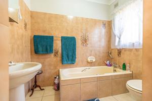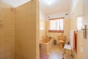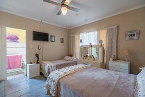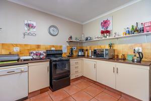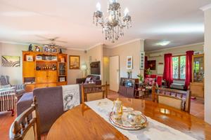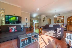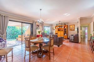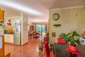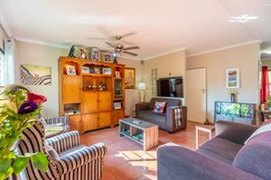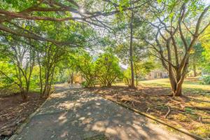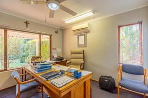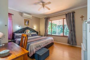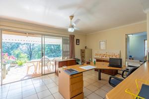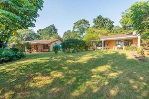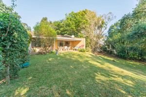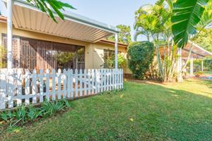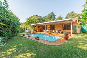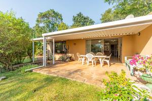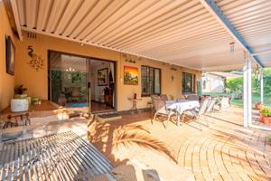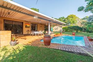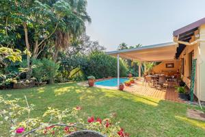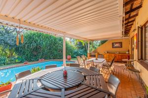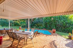 Relax and entertain in the beautiful outdoor patio area, featuring a sparkling swimming pool and a park-like garden. The property also includes a triple carport, an outdoor toilet with a shower, and a Wendy house for storage.