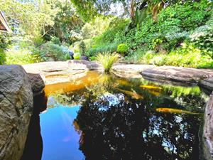 Set in the sought-after Maytime / Kloof Golf Course SRA, this remarkable property offers a rare blend of luxury lodge-style architecture, natural beauty and central convenience. With its African-inspired design elements, koi pond entrance and warm timber finishes, the home delivers a private retreat atmosphere without sacrificing access to schools, amenities or major routes.